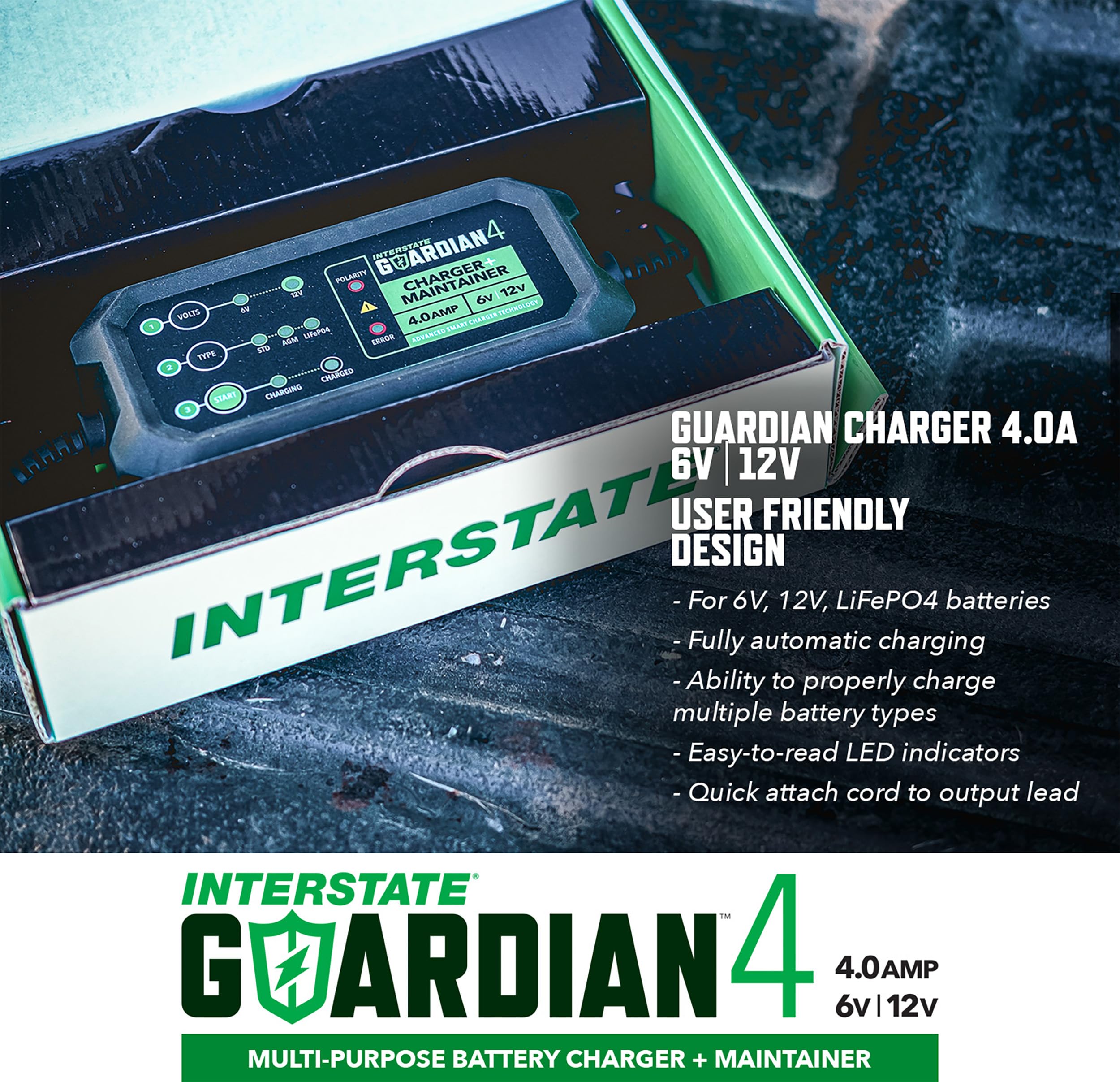 - SOPHISTICATED AND EASY-TO-USE: The Interstate Guardian 4 keeps your equipment good to go. It’s perfect for charging your car battery every day or long-term storage as an auto or marine battery charger or ATV battery charger. The microprocessor controlled smart charger automatically switches to maintenance mode when a battery is recharged. The LED indicators tell you exactly what it’s doing, eliminating any guesswork