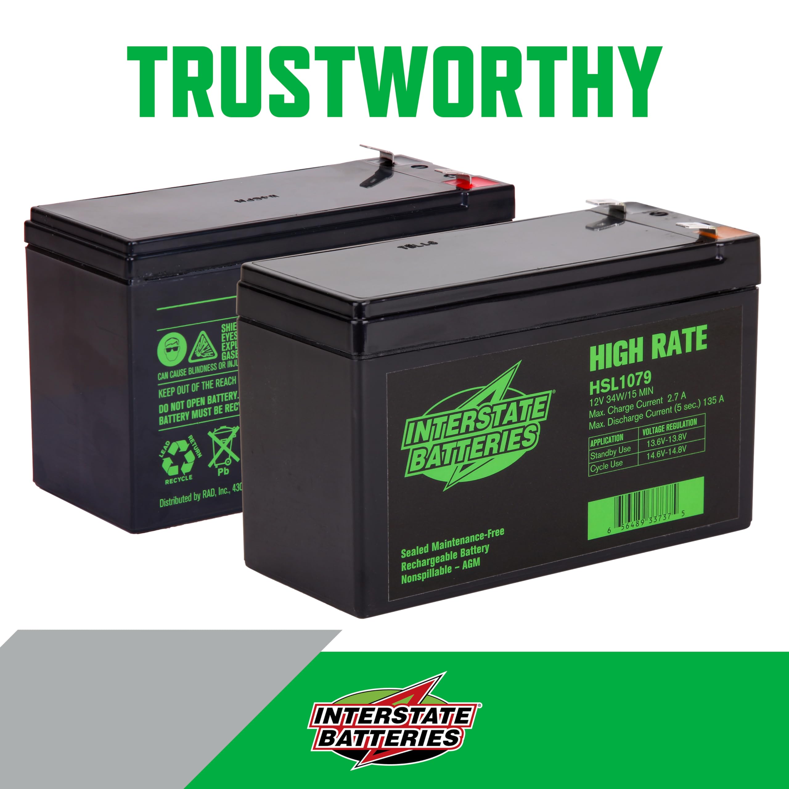 - HIGH-RATE SLA BATTERY: When power interruption is unthinkable, think Interstate high rate SLA batteries. Ensures unbeatable backup for non-stop operation for UPS float standby systems and heavy-duty servers. Superior plate-to-terminal connections mean critical power – fast! VRLA technology to eliminate spills and over-pressurization. Backed by a 12-month performance warranty, making them Outrageously Dependable