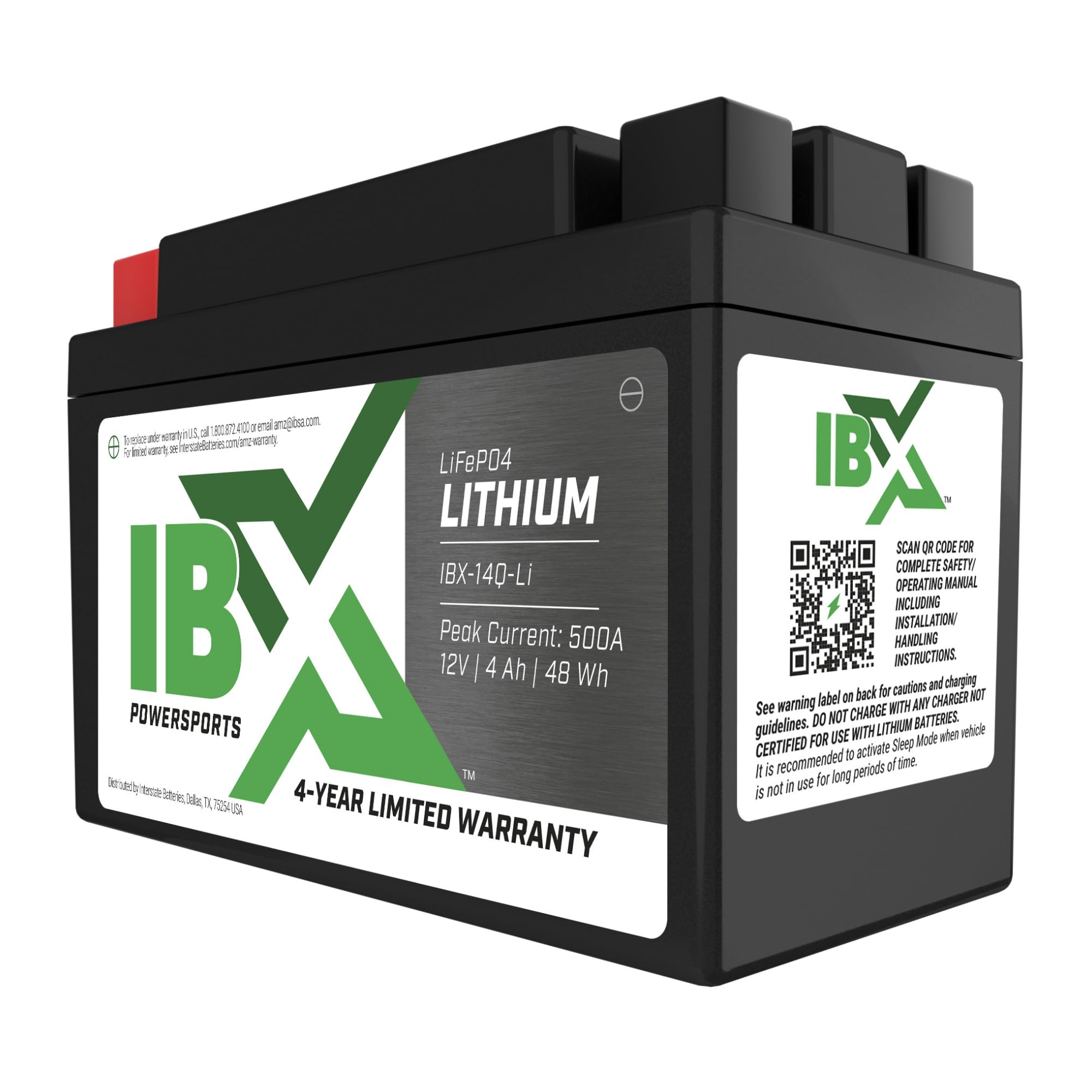 PRODUCT SPECS: IBX-14Q-Li is a 12V 4Ah lithium powersports battery measuring 5.28 in length, 2.56" in width and 3.62" in height. This lightweight battery only weighs 2.4lb. This battery comes with a 4 year free replacement from purchase date.